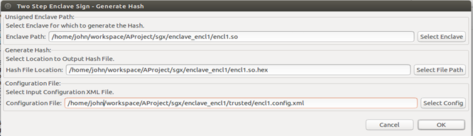 .hex extension added. To change the path, click Select File Path to open a file dialog to select the file path.Click OK after you fill in all the fields. The Intel(R) SGX SDK is launched under the hood with the provided parameters and the hash file is generated. A dialog box appears to confirm the completion: