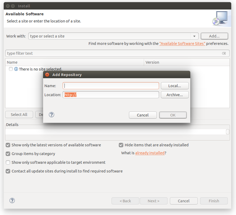 Go to Help menu -> Install New Software. Click the Add button for the Work with field to open the Add Repository dialog as shown in the following graphic: